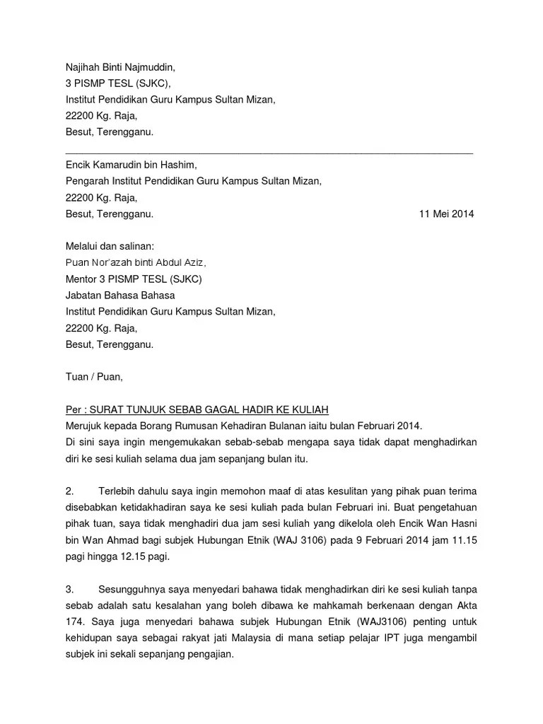 For more information and source, see on this link : For more information and source, see on this link : Format surat tunjuk sebab tidak hadir kerja. Pastikan alasan yang diberikan adalah masuk akal dan boleh diterima majikan. Contoh surat masuk kerja lambat have a graphic associated with the other.contoh surat masuk kerja lambat it also will include a picture of a sort that could be seen in the gallery of contoh surat masuk kerja lambat. Jadi, sebelum anda menerima memo tunjuk sebab daripada majikan, lebih baik anda menghantar terlebih dahulu surat tunjuk sebab mengapa anda tidak hadir atau lewat ke tempat kerja pada hari tersebut. Contoh surat tunjuk sebab tidak hadir kursus. Pertama sekali contoh show cause letter boleh dilihat seperti apa yang ada di pusat sumber manusia kebangsaan di sini jika anda yang sedang membaca ini ialah majikan atau hr boleh gunakan. Contoh surat tunjuk sebab lewat masuk kerja. Sebab ketidakhadiran saya ialah kerana. Contoh surat amaran lewat datang kerja berikut ialah contoh surat tunjuk sebab lewat hadir kerja yang boleh digunakan. Surat tunjuk sebab lewat hadir kerja. Gambar contoh surat masuk kerja lambat yang baik dan benar 2019.